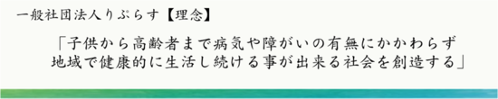 【一緒に活動する仲間を募集しています】 お知らせ 2015年04月14日 理念に共感するスタッフを募集しております。 <理念> 子供から高齢者まで病気や障がいの有無にかかわらず地域で健康的に生活し続ける事が出来る社会を創造する。 <求める人材> ・自分の心身の健康を自分で守るべく、適した行動をする人 ・社会に必要とされる領域を開拓する人 ・プロとして、人と社会の未来を考え、学び、実践し続ける人 ・人を愛し愛されるよう行動する人 ・素直な人 <実際の活動> ・デイサービス(高齢者、障がい児、障がい者) ・フィットネス ・健康サポーターの育成 ・コミュニティースペースの運営など <活動実績紹介> ◯「forbes japan」 ◯「復興庁監修 被災地の元気企業40」 ◯「理学療法ジャーナル2015年3月号」 ◯「2015.3.13 産経新聞」 <活動報告> http://rilink.is-mine.net/houkoku2014.html <勤務場所> 石巻市または登米市 <職種> ①専門職 看護師(准看護師)、PT、OT、ST、社会福祉士、介護福祉士、社会福祉主事などの医療、福祉職 ②事務局スタッフ ソーシャルビジネスの運営に関するバックオフィス業務。 <働き方> 常勤、非常勤については、相談の上決定します。 パートに関しては、4時間以上、週2回から検討しています。 <給与> 勤務経験等に応じて決定。 応相談。 <その他> まずは、お気軽に見学にお越し下さい。 一般社団法人りぷらすweb site