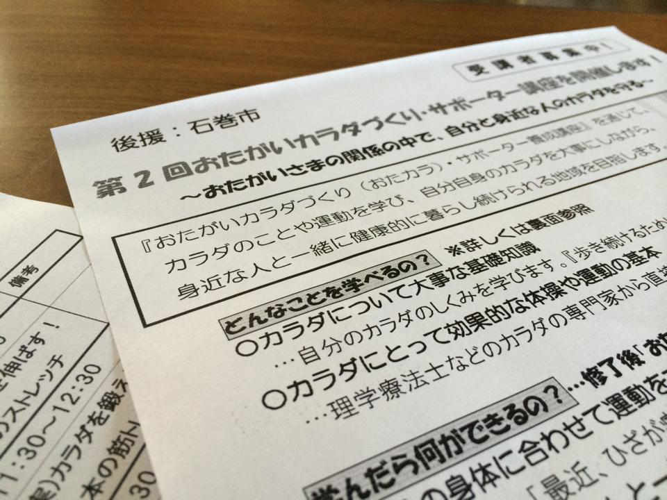第2回おたカラ・サポーター養成講座のお知らせ コミュニティヘルス 2014年10月12日 スタッフの落合です。 先週に引き続き、全国各地で台風による被害拡大が心配されております。 皆さまがお住まいの地域は如何でしょうか。どうかご安全にお過ごしください。 +‥‥‥‥‥‥‥‥‥‥‥‥‥‥‥‥‥‥‥‥‥‥‥‥‥‥‥‥‥‥‥‥‥‥+ 【第2回おたカラ・サポーター養成講座のお知らせ】 さて、りぷらすが9月より開催している、 「おたがいカラダづくり(おたカラ)サポーター養成講座」 第2回目を11月10日〜20日(4日間)の日程で開催致します! まずは自分自身のカラダを気にしながら、 身近な家族やご近所さん、地域のみんなと一緒になって健康を守りあう。 そのための基礎知識や基本の体操、運動を学んでみませんか⁉︎ 「元気でいたい!」 「誰かの役に立ちたい!」 そんな気持ちがある人にオススメです。 受講者絶賛受け付け中です!! ご興味のある方は是非お問い合わせ下さい。 ◆お問い合わせ: 0225-98-8957(落合) 【過去記事も是非ご覧ください】 ◆「できたーっ!」 ◆素敵なお花を頂きました。 【PR】 ◆代表理事のインタビュー記事が掲載されています。 ForbesJapan (フォーブスジャパン) 2014年 9月号 [Kindle版] 一般社団法人りぷらすweb sitePR