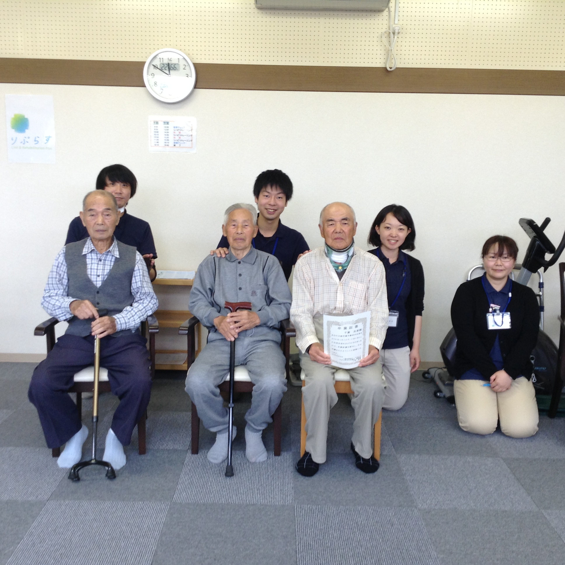 スタジオぷらす登米「7人目の卒業者」 デイサービス 2016年07月04日 6月末に卒業式を行いました。 Aさん(仮名)は、頸髄を圧迫する腫瘍を取り除く手術を無事に乗り越えた後も、リハビリの継続を希望されていました。Aさんが、スタジオぷらす登米の利用を開始したのは、昨年の7月。利用開始当時は、「立ち上がりや歩行時のふらつきを良くしたい、特に外でのふらつきやしゃがむ動作を改善したい」とお話しされていました。その理由は、「盆栽の再開」。Aさんは、手術前まで、盆栽を品評会に出すほど熱心に活動をされていたのだそうです。 スタジオぷらす登米では、まず、手術前後の安静により失われた筋力と歩行耐久性を改善する運動に取り組みました。運動は、頸椎に負担がかからないように行わなければなりません。そのため、全身の筋力を満遍なく鍛えることを目的としたエアロバイク漕ぎを導入。それに加えて、自宅での自主トレーニングを提案しました。 筋力と耐久性の改善が見られてきたところで、応用歩行やバランス練習(しゃがむ動作など)を取り入れていきました。 すると、夜間でも自室ベッドからトイレまでの移動できるようになるなど、日常生活にも変化が現れました(以前までは「歩行器」を使用していました)。 Aさんは、その後も懸命にリハビリを継続され、利用開始から1年を前に目標を達成。「さつきを品評会に出展」するまでに至りました。 さらに、Aさんは周囲の方に「手伝うからやってみろ」後押され、田んぼの作業に挑戦。屋外での活動が増えてこともあり、スタジオぷらす登米の利用については、週に1回から2週間に1回と変更しました(6月〜)。回数を減らす際にはご本人から「少し不安だな」という言葉も聞かれましたが、身体機能や日常生活の変化が生じていないか、不安な所がないかなど、ご本人やご家族、ケアマネージャーさんに確認する場を設けることで、徐々に自信をつけていかれたようです。卒業間際には、ご家族から、「車に乗って友達の所にいくようになったから平気だと思います」と、嬉しいお話を聞くことができました。 卒業式の際には、「心配な事や気になる事があったらいつでも相談して下さい」とお伝えし、笑顔でお見送りしました。Aさんの健康とますますの活躍を願っています! スタジオぷらす登米 管理者 小田智樹 一般社団法人りぷらすweb sitePR