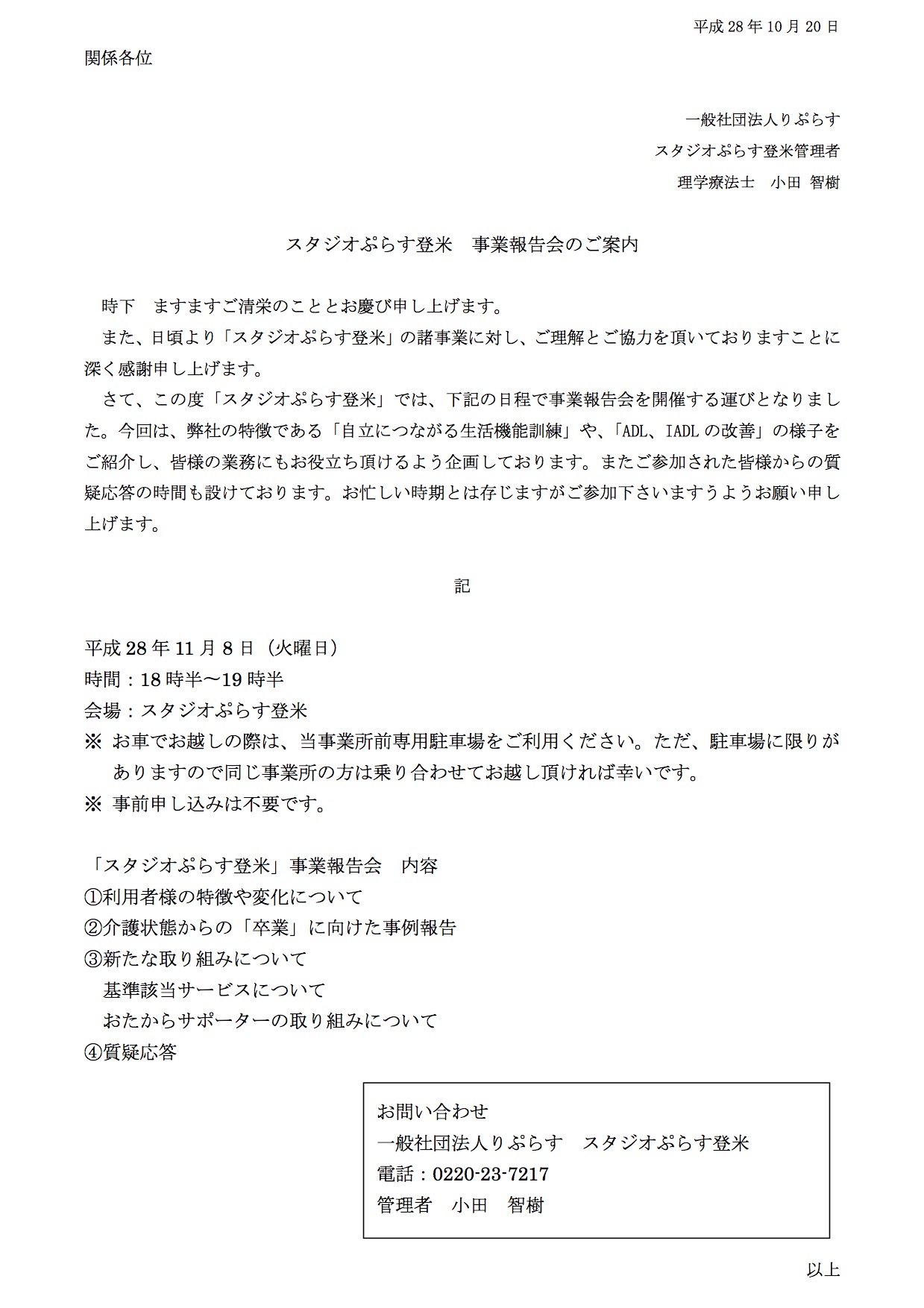 スタジオぷらす登米 / 事業報告会のお知らせです デイサービス 2016年10月26日 スタジオぷらす登米より【事業報告会開催】のお知らせです。 日ごろ応援してくださる皆さまへ感謝の気持ちを込め、利用者様の変化やデイサービスからの「卒業」に向けた取組事例などをお話させて頂きます。ご都合がつきましたら是非ご参加くださいまようお願いいたします。 (遠隔地の方には「Skype」でのご参加も可能です。同時通信の人数に限りがありますので、事前にご相談ください:りぷらす「facebookページ」にて承ります) ◆開催日時:平成28年11月8日(火曜日)18時半〜19時半 ◆場所:スタジオぷらす登米 ※お車でお越しの際は、当事業所前専用駐車場をご利用ください (駐車場に限りがありますので同じ事業所の方は乗り合わせてお越し頂ければ幸いです。) ※事前申し込みは不要です。 ◆事業報告会・内容 ①利用者様の特徴や変化について ②介護状態からの「卒業」に向けた事例報告 ③新たな取り組みについて (基準該当サービスについて・おたからサポーターの取り組みについて) ④質疑応答 ◆スタジオぷらす登米・最新記事はこちらです。 「歩けるようになったら…」 スタジオぷらす登米 管理者・小田智樹 一般社団法人りぷらすweb site