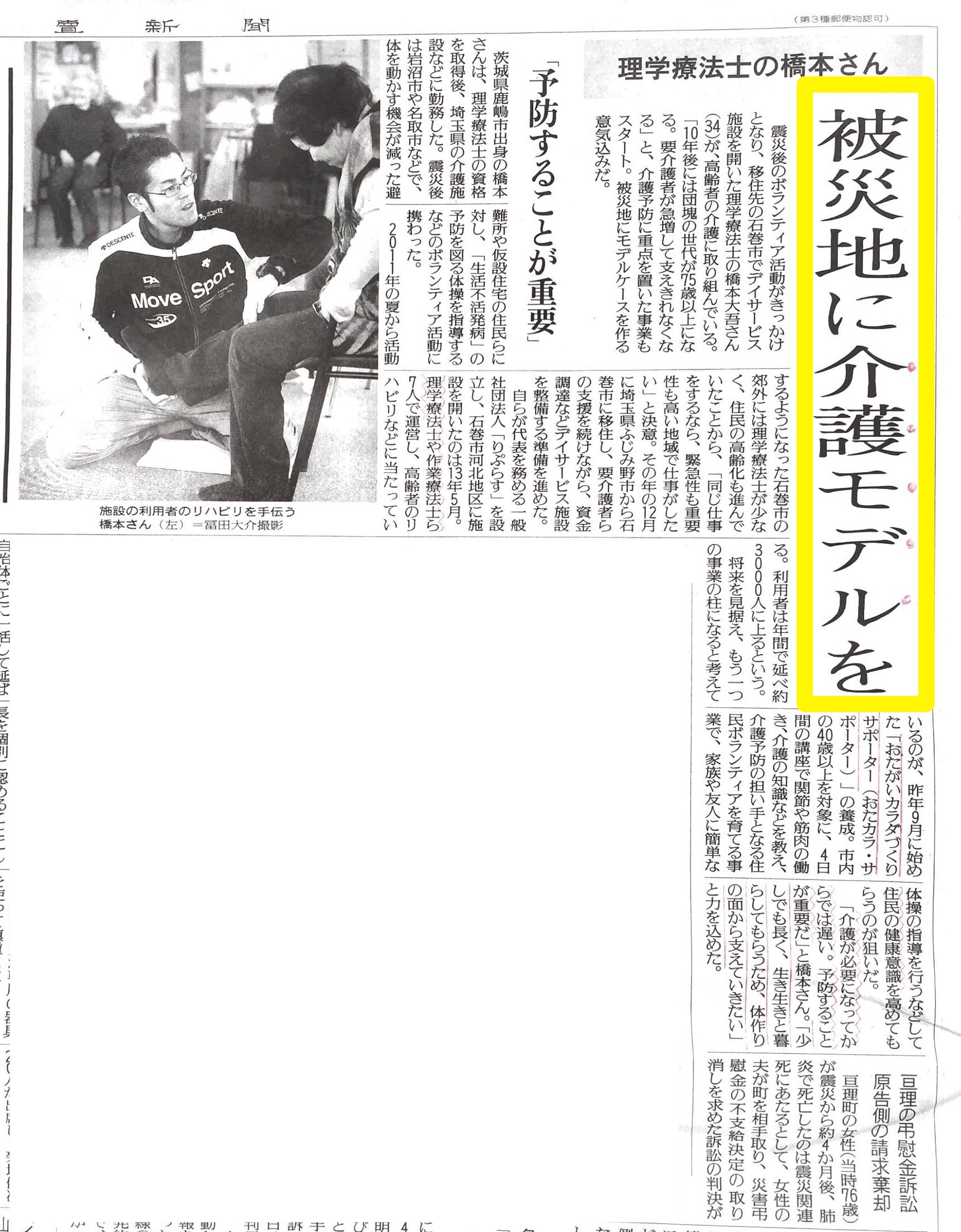 【平成26年9月27日河北新報朝刊】 メディア紹介 2014年10月07日 9月より開始し25日に終了した、 「おたがいカラダづくりサポーター養成事業」について 本日の朝刊15面に掲載されました。 サポーター事業の第2期は11月に行いますので、 ご興味のある方は是非お問い合わせ下さい。 ◆ご連絡は、0225-98-8957(落合)まで宜しくお願い致します。 ※掲載新聞記事内容に修正点があります。 (誤)「常駐6名」➡(正)「常駐4名」 一般社団法人りぷらすweb site