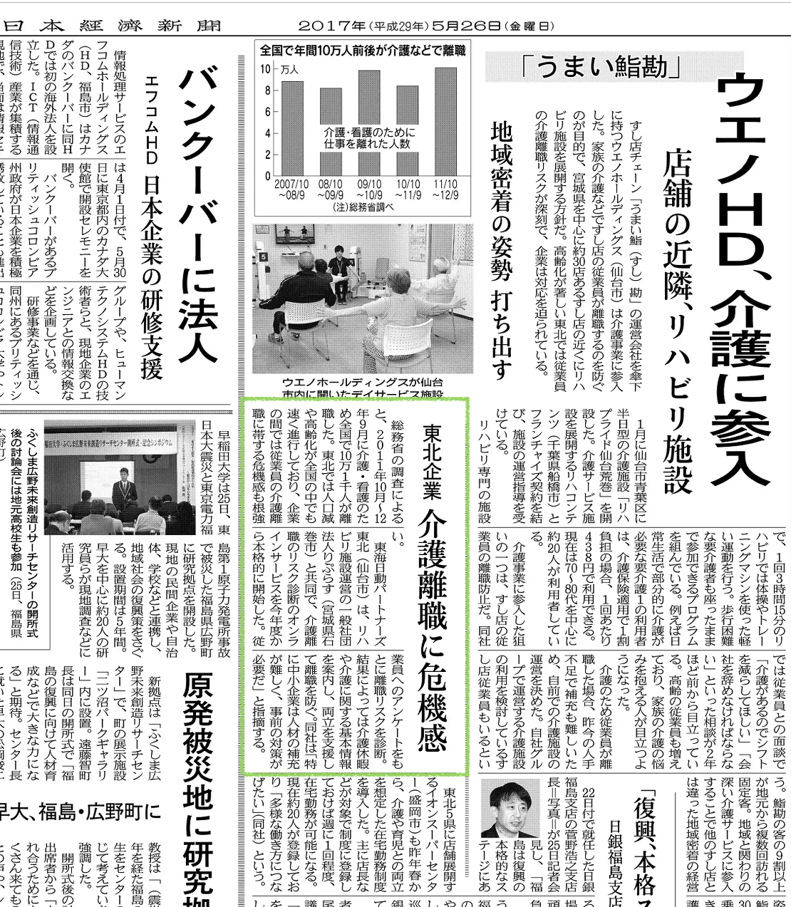【日本経済新聞に掲載されました】介護離職リスク診断オンラインサービス 仕事と介護と家庭の両立 2017年05月31日 「介護離職のリスク診断オンラインサービス」 東海日動パートナーズ東北さまと共同開発を進めておりました「介護離職のリスク診断オンラインサービス」が今年度より本格始動。5月26日付けの日本経済新聞に掲載されました。 (東北企業、介護離職に危機感 以下、2017/5/26付日本経済新聞より転載) 総務省の調査によると、2011年10月~12年9月に介護・看護のため全国で10万1千人が離職した。東北では人口減や高齢化が全国の中でも速く進行しており、企業の間では従業員の介護離職に帯する危機感も根強い。東海日動パートナーズ東北(仙台市)は、リハビリ施設運営の一般社団法人りぷらす(宮城県石巻市)と共同で、介護離職のリスク診断のオンラインサービスを今年度から本格的に開始した。従業員へのアンケートをもとに離職リスクを診断。結果によっては介護休暇や介護に関する基本情報を案内し、両立を支援して離職を防ぐ。同社は「特に中小企業は人材の補充が難しく、事前の対策が必要だ」と指摘する。東北5県に店舗展開するイオンスーパーセンター(盛岡市)も昨年春から、介護や育児との両立を想定した在宅勤務制度を導入した。主に店長などが対象で制度に登録しておけば週に1回程度、在宅勤務が可能になる。現在約20人が登録しており「多様な働き方につなげたい」(同社)という。 (日本経済新聞電子版にご登録の方はコチラで全文をご覧になれます) 一般社団法人りぷらすweb sitePR