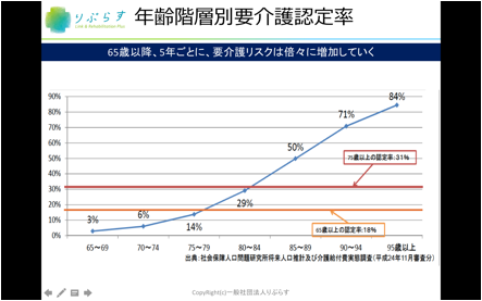 70~74歳では、およそ16人に1人、75~79歳ではおよそ7人に1人、80~84歳ではおよそ3人に1人が要介護の認定者となっています。つまり要介護認定率は、5歳増えるごとにおよそ2倍ずつ増えていることが分かります。
