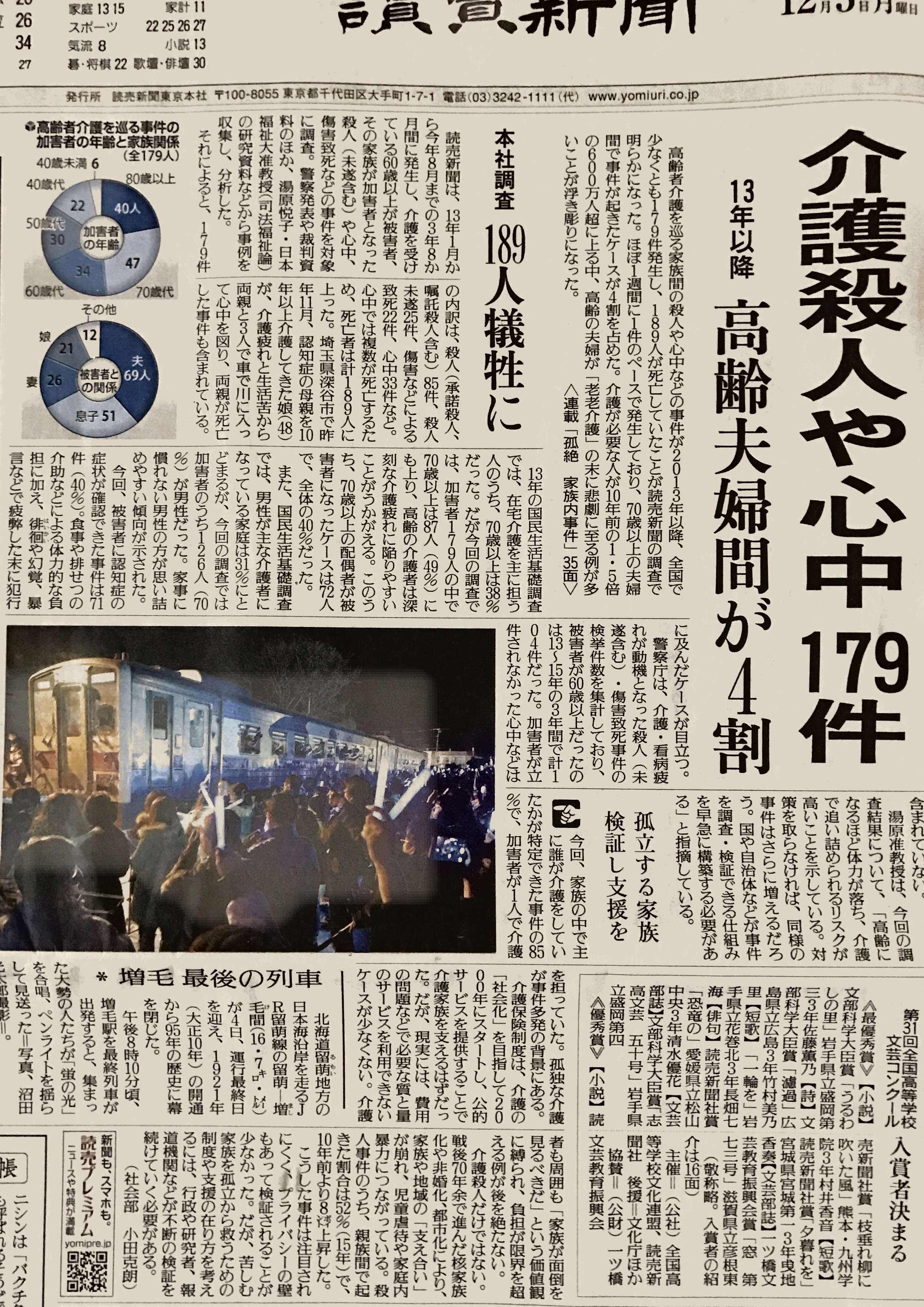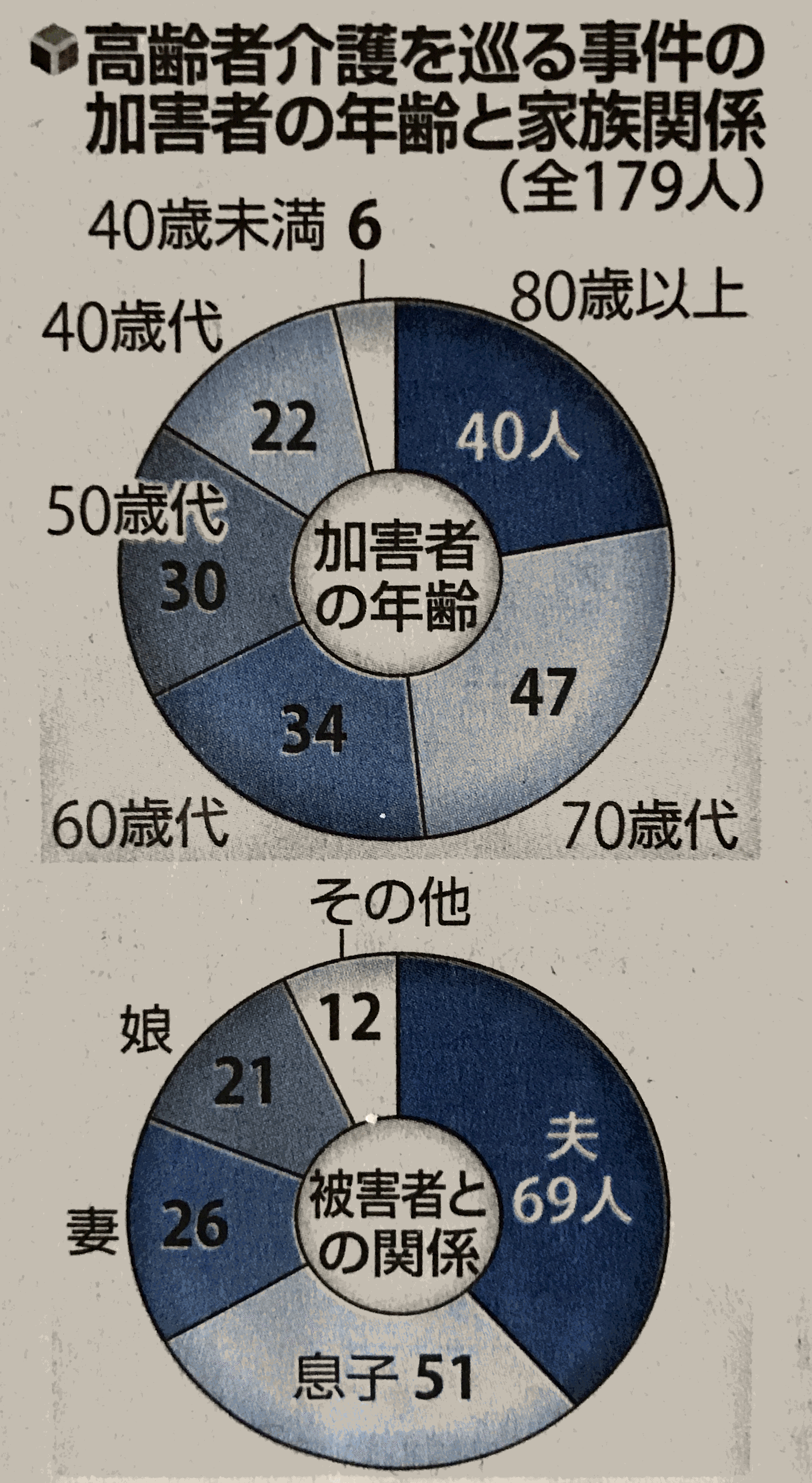 高齢者介護を巡る家族間事件~1週間に1件の割合で発生?!~ 仕事と介護と家庭の両立 2016年12月05日 【2016年12月5日読売新聞一面より】 2013年1月から今年8月末までの間、介護を受けている60歳以上が被害者、その家族が加害者となった事件(殺人事件・心中・傷害致死事件など)の発生件数は全国で少なくとも179件、亡くなった方は189人。ほぼ1週間に1件のペースで、このような事件が発生していることが明らかになったそうです。このうち「70歳以上の夫婦間で事件が起きたケースが4割を占めた」とあります。 別の調査からは、高齢の男性が慣れない家事と介護で思い詰め、あるいは認知症を患い、その介護負担により犯行に及んだケースが目立つ傾向も見られたそうです。また、加害者の年齢とその関係については、加害者が夫や妻、だけではなく40〜50代以上の「息子」や「娘」となるケースも、決して少なくないという点にも注目しなければなりません。 (中山奈保子) 一般社団法人りぷらすweb site
